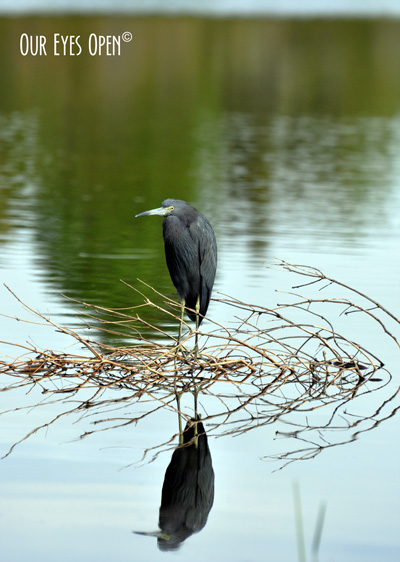 Little Blue Heron posing on a branch in shallow water. The reflection is almost as amazing as the bird itself. One of our favorite wadding birds.