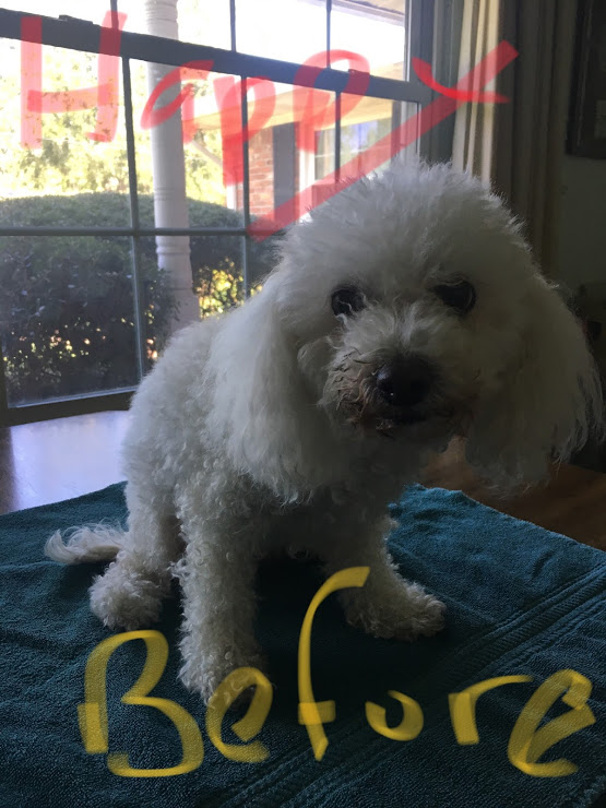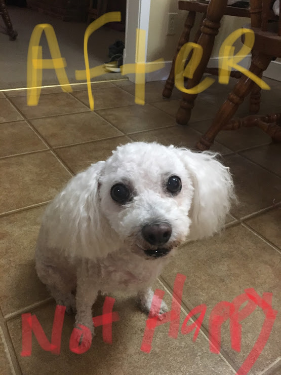 This is our dog Heaven. She is a 13 year old Bichon Frise. She was the runt of the litter & has been the “Best Dog Ever”. She pees like a male. Hikes that leg up as high as it will go. She hates taking a bath & if I say the word out loud, she cowers & ducks behind Frank. She plays hide & seek. We hide & she has to find us. Some days she finds us quick & other days we get her good! Heaven only barks when someone rings the doorbell. While on a walk, other dogs can be barking & she just trots along like nothing is going on. She is friendly to other dogs & cats. Heaven helped us, me mostly, when my grand-daughter passed away almost 11 years ago. She is truly our best friend!