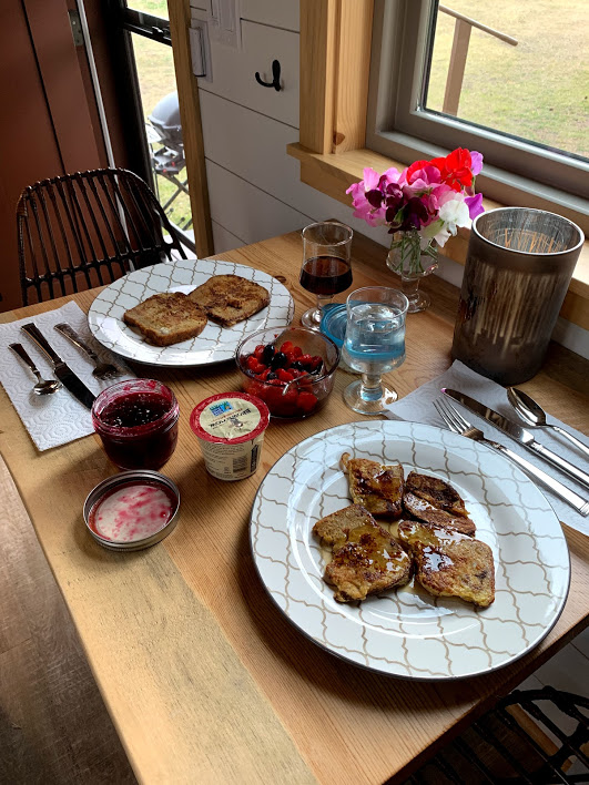 While Frank was packing up the kayak and loading our luggage into the minivan, I prepared breakfast. French toast was on the menu on our 5th day of vacation. I set the table and finished cooking with the ingredients provided by Carol. With the ambience of our setting in this beautiful little home along the river, the food tasted even better than it looks.