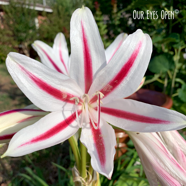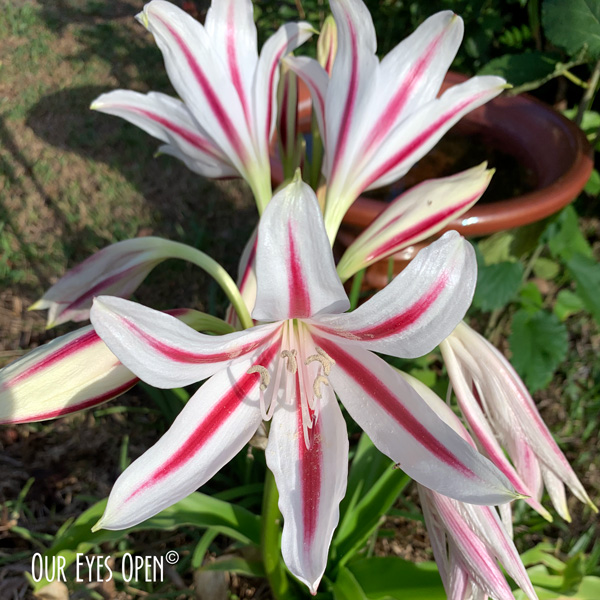 This candy-striped white and maroon lily is a rare milk and wine crinum and was first grown in American gardens in the early 1800’s. It becomes a large clump, as you can see in the photo above in one season and produces side bulbs for division.