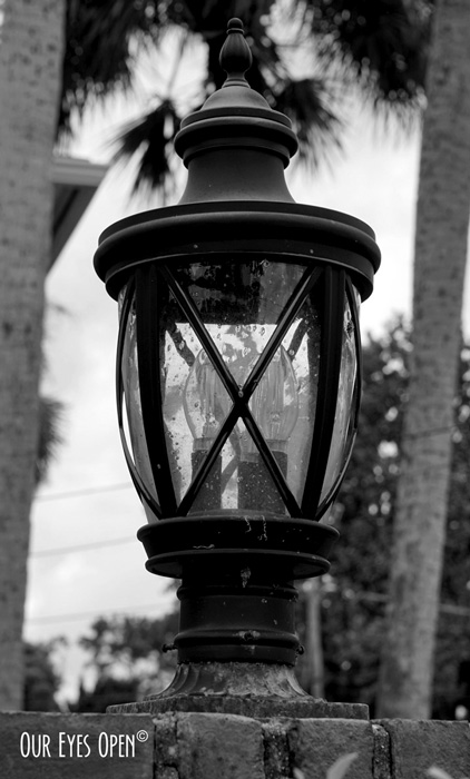 Lamp atop the brick wall separating our driveway from our neighbor’s house.