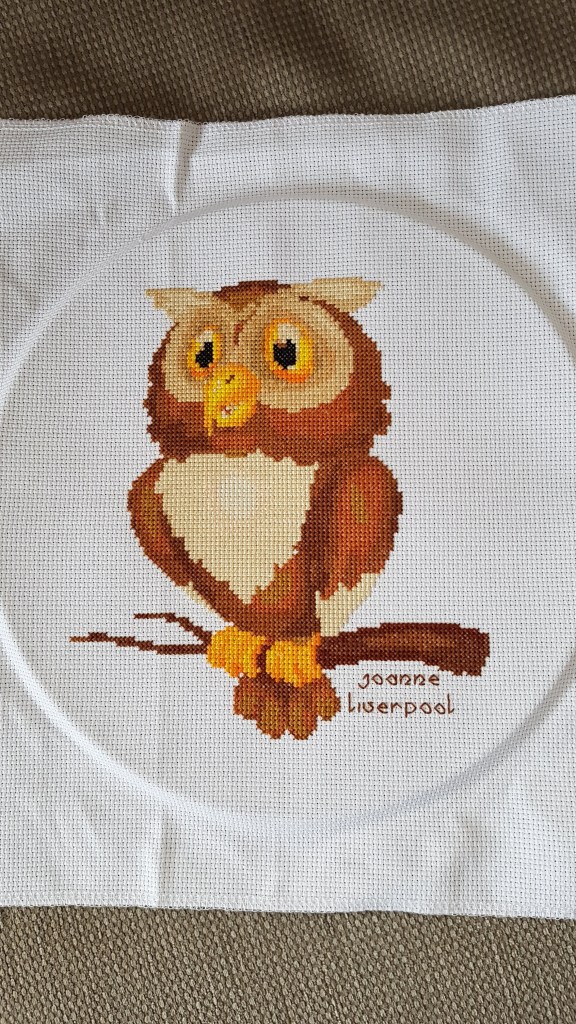 Joanne’s cross stitch owl that was placed in a square on a quilt for a child who has a life-limiting illness.