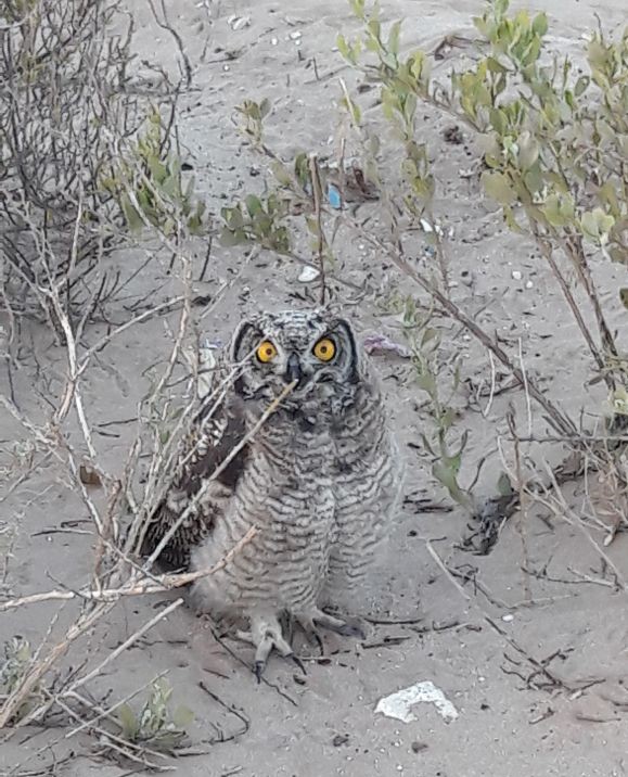 Aletta’s Spotted Eagle Owl is posing right up while standing in the sand while Anita’s Great Horned Owl is stuck in traffic.