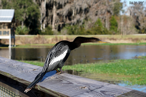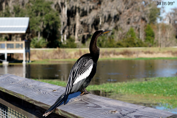 Anhingas are large and slender birds with a “S” shaped neck. They swim and dive live dabbling ducks with their webbed feet, however, their bodies are fully submerged and all you will see is their head and neck sticking out of the water. The are also called Snake Birds. They catch fish and eat them whole. The images in this post is a male with his silvery white streaks on his wings and back.