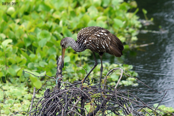 Limpkins are brown and white birds with a very loud piercing call. They are a tropical wetland bird that resembles herons and egrets, however they are more closely related to rails and cranes. They supposedly got their name from early European settlers because their gait looks more like a limp. They live and hunt in shallow freshwater swamp forests, wetlands, ponds, lakes and marshes. They stalk and eat apple snails, day and night. The male usually selects the nesting site by pulling at the vegetation around the spot and calling softly. Even softly, it is a high pitched sound; only quieter.